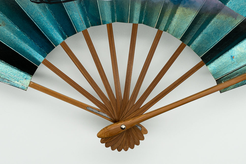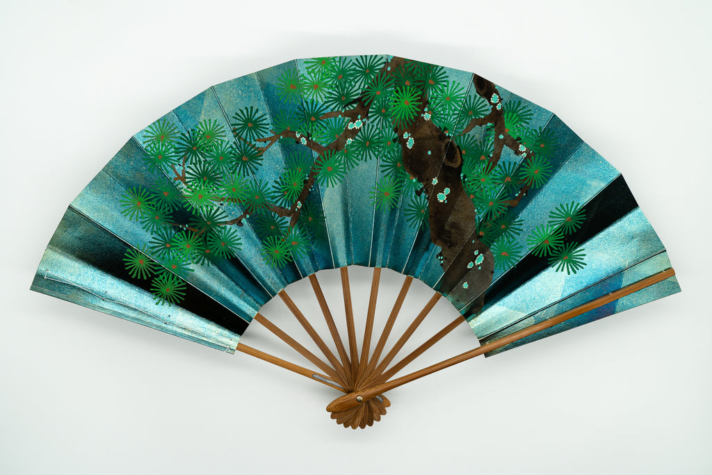 【ビンテージ品】片面に富士山と鶴、片面に松が手描きで描かれています。深みのある青貝箔地の色調が美しく、モダンな雰囲気もあわせ持った珍しい一品です。