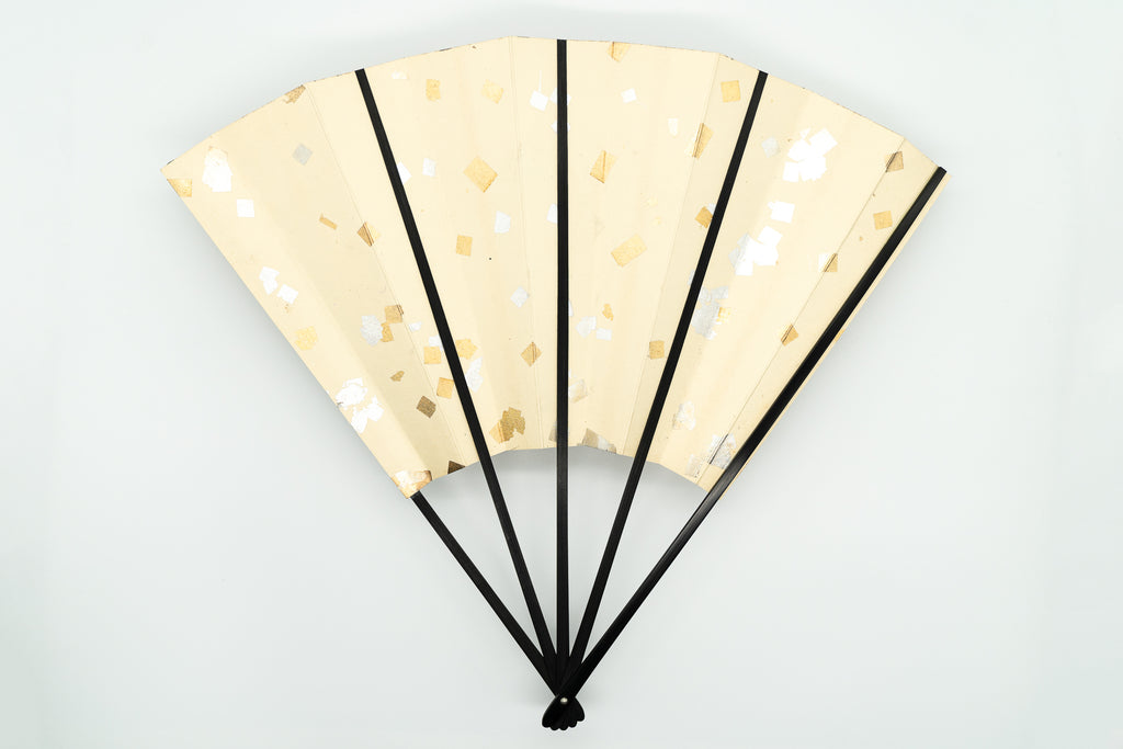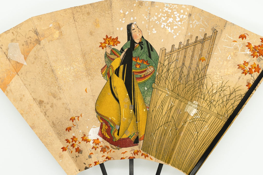 【一点もの・ビンテージ品】蝙蝙蝠扇は平安時代に生まれ、古くは紙扇・紙張り扇の総称でした。扇を開いた形がコウモリの羽に似ているからとも言われています。フォルムが美しく、インテリアに取入れやすいちょうど良いサイズでおしゃれに飾っていただけます。こちらは上品なベージュ系の地紙に紅葉狩りの絵柄が描かれています。ビンテージならではの質感と落ち着いたお色味がシックな逸品です。