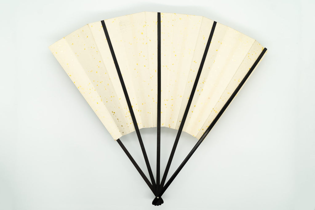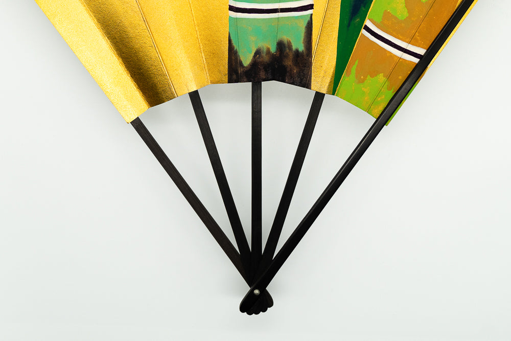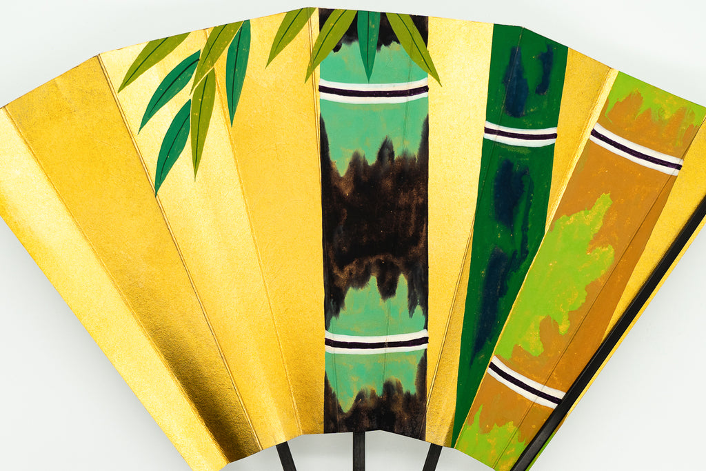 【一点もの】蝙蝙蝠扇は平安時代に生まれ、古くは紙扇・紙張り扇の総称でした。扇を開いた形がコウモリの羽に似ているからとも言われています。フォルムが美しく、インテリアに取入れやすいちょうど良いサイズでおしゃれに飾っていただけます。こちらは金箔地の扇面に三色の竹が手描きで描かれています。