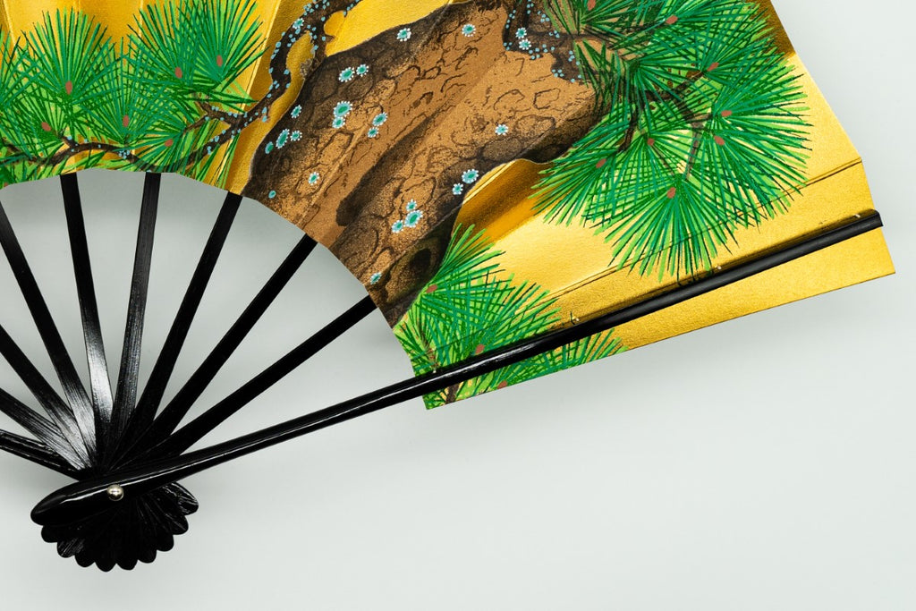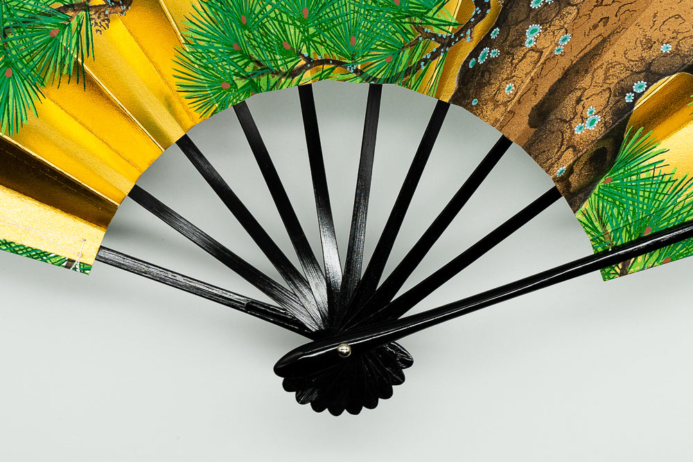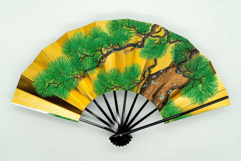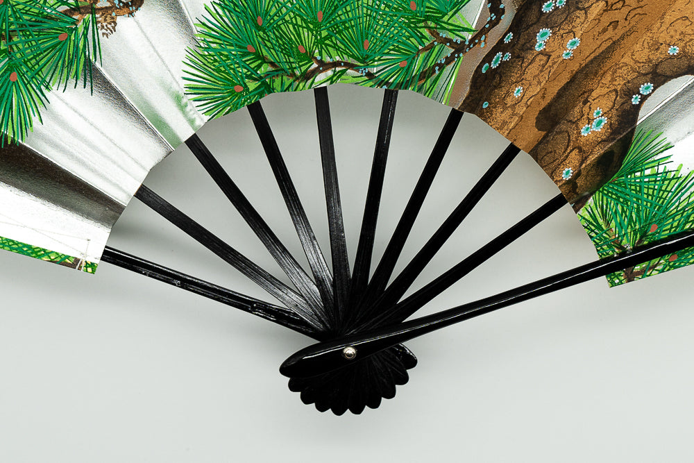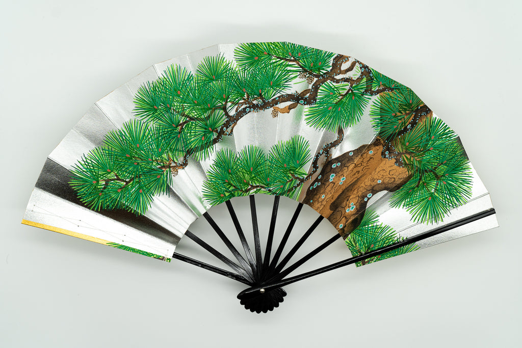 片面は金箔地、片面は銀箔地の扇面に老松が描かれております。通年でご使用いただけます。