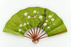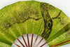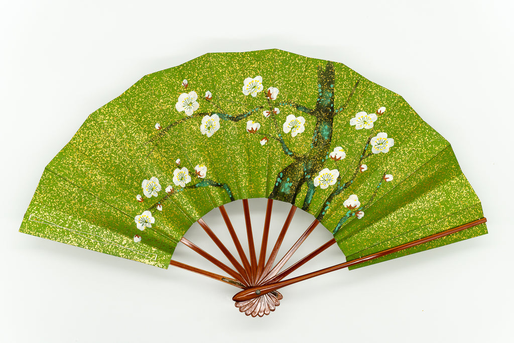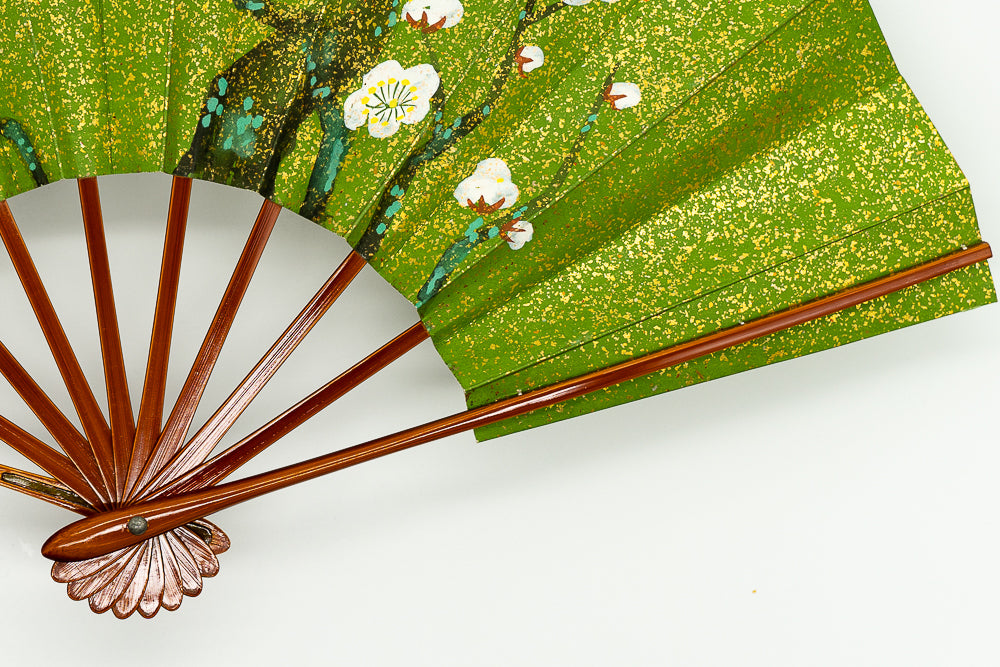 一面金砂子の地紙に松、もう片面には白梅が手描きで描かれています。金砂子と墨絵の松の調和が美しく、白梅は花びらが浮き立つように表現されています。春慶塗りの骨が上品にマッチして扇面のデザインを引き立たせています。