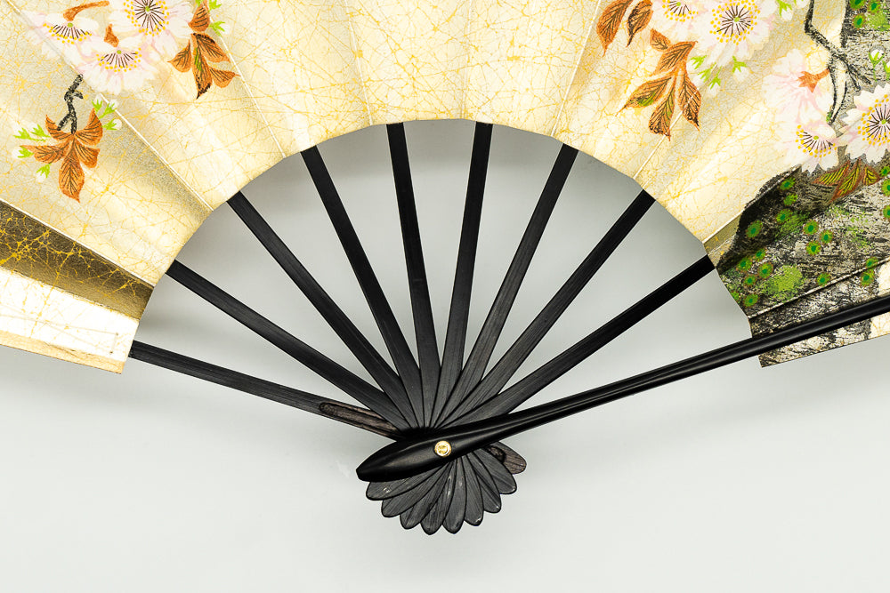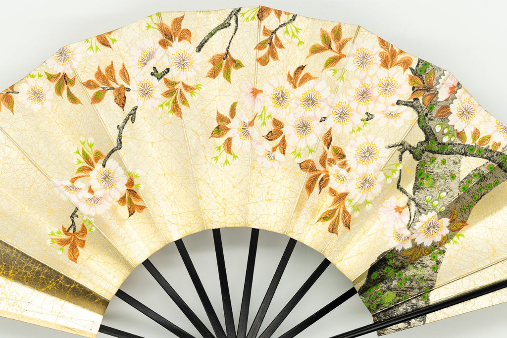 上質な金もみ地に落ち着いた上品な色調の桜、もう片面には御所車と秋草があしらわれています。季節に合わせて通年ご利用頂けます。