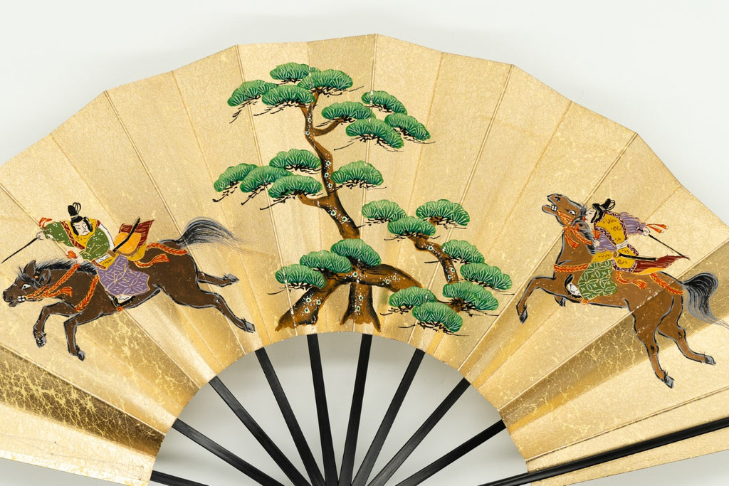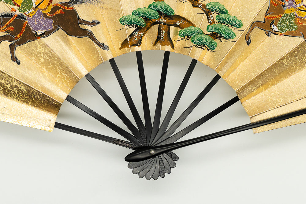 【ビンテージ】上質な金もみ地に古式競馬の様子が躍動的に描かれています。お扇子の絵柄としては珍しく手描きならではの味わい深さを楽しんで頂ける作品です。
