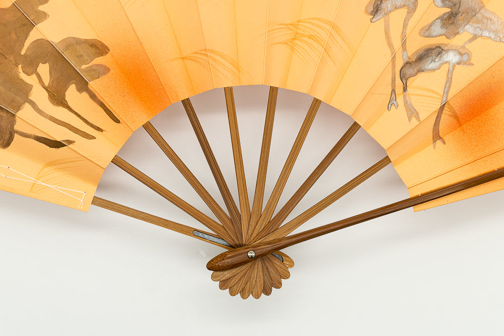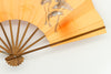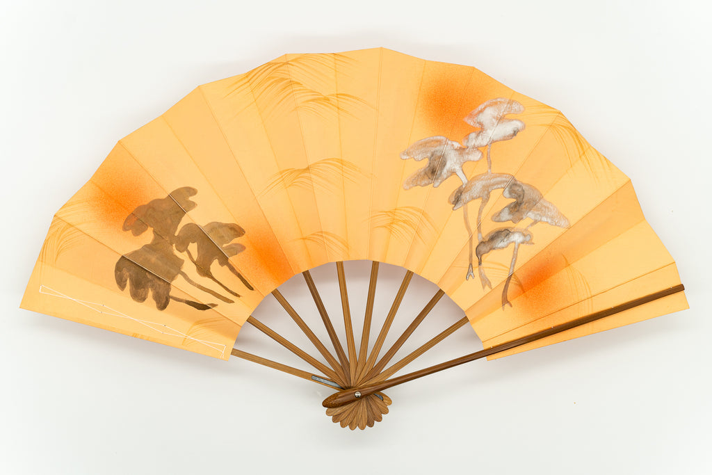薄オレンジ色の地紙に金銀の光琳松が描かれています。薄朱色のぼかしがアクセントになり、柔らかくエレガントな雰囲気を纏っています。大き目のサイズで存在感があります。