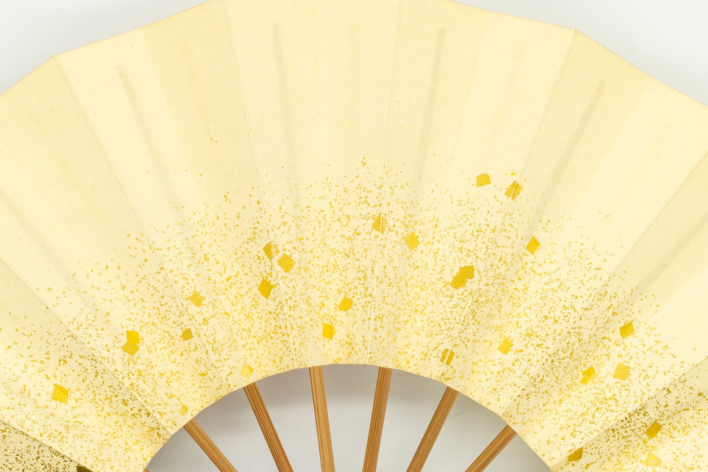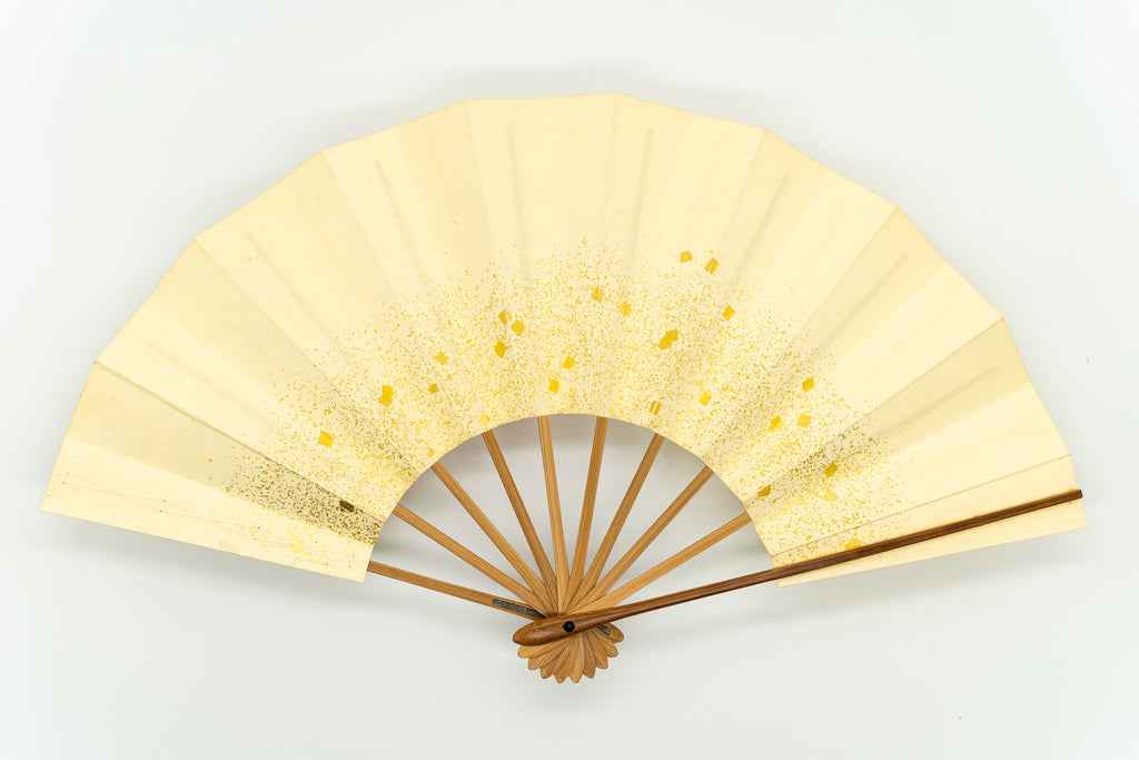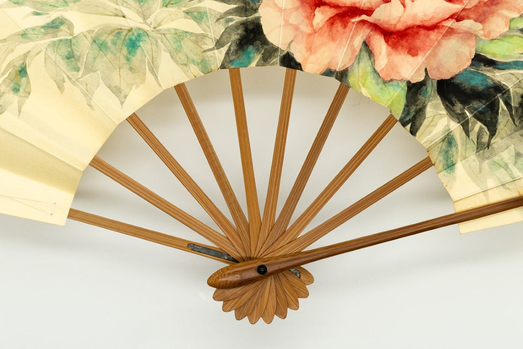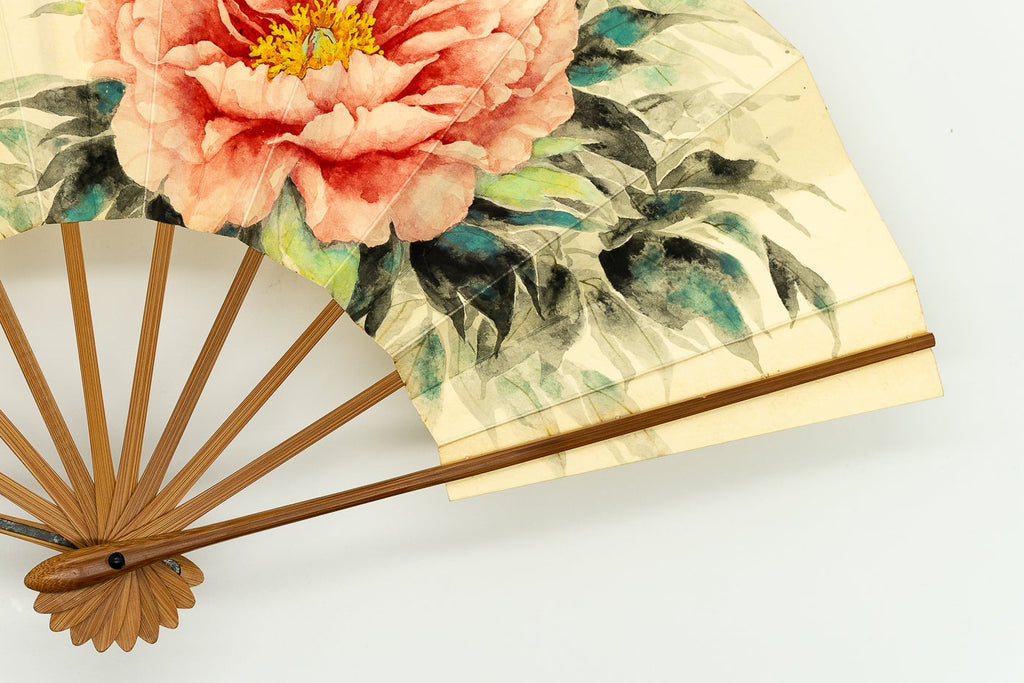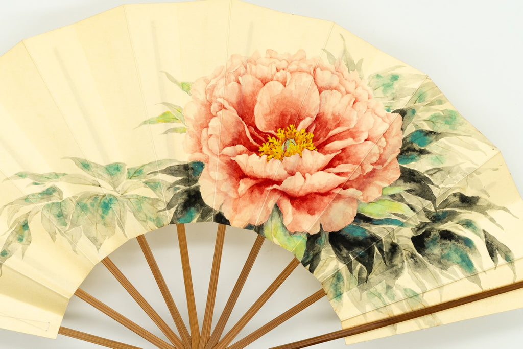 【ビンテージ品】鳥の子地の扇面に手描きで牡丹を描いています。落ち着いた色調で上品な雰囲気に仕上がっています。