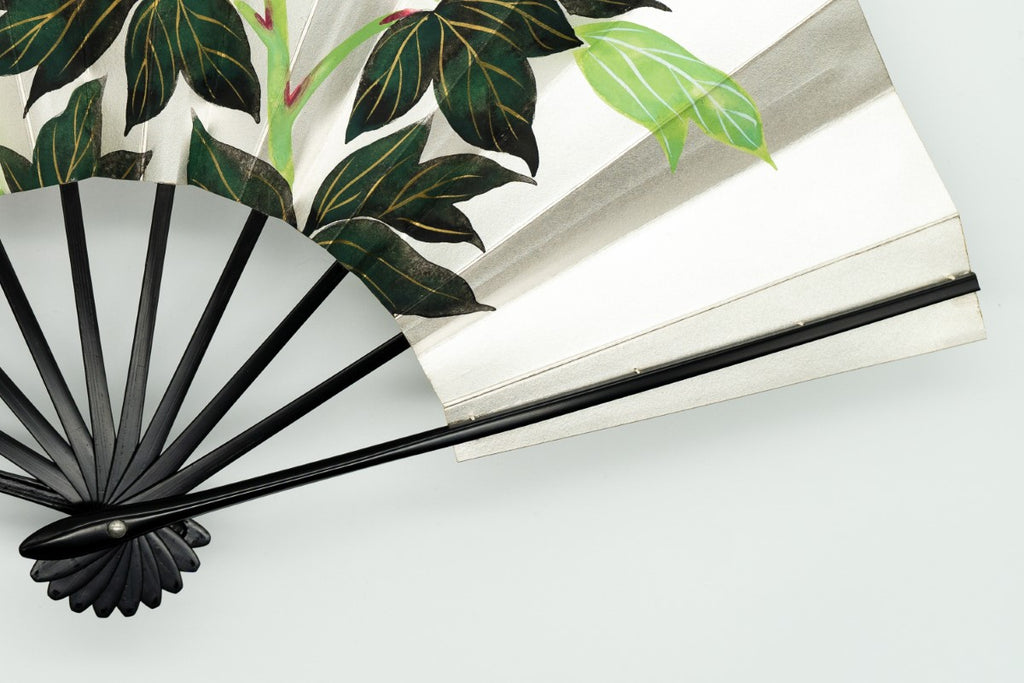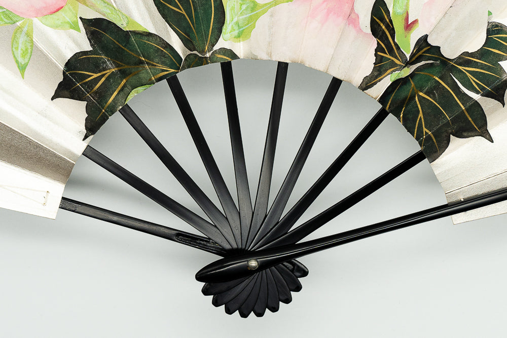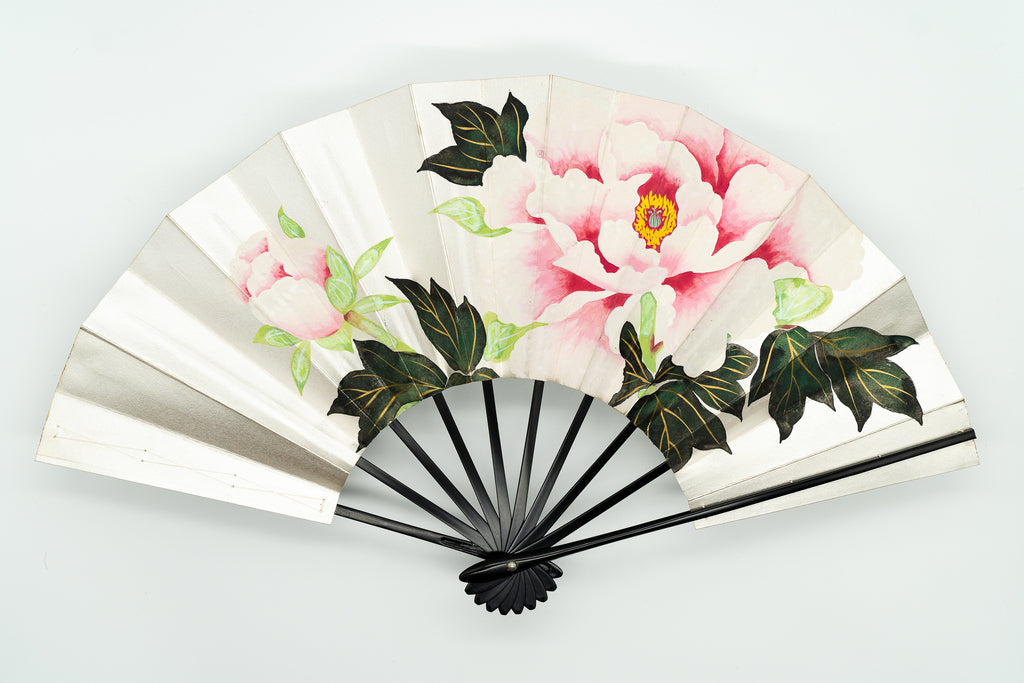 【ビンテージ】銀ハキ地の扇面に片面には大ぶりの牡丹、片面には蕾が手描きで描かれています。お好みに合わせて両面お使いいただけます。