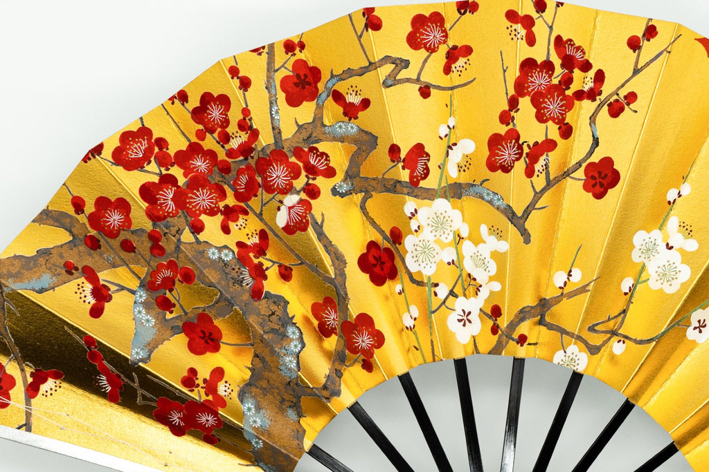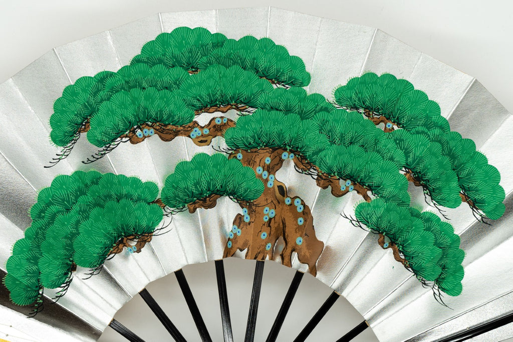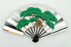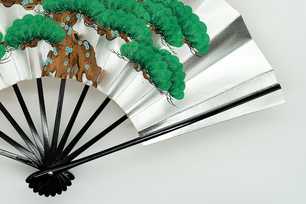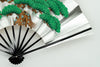 片面は金箔地に紅白梅、片面は銀箔地の扇面に舞台松が描かれています。お好みに合わせて両面お使いいただけます。お目出度い席の飾りに最適です。
