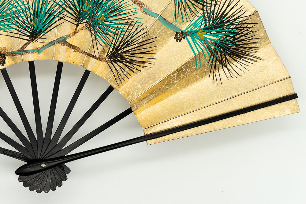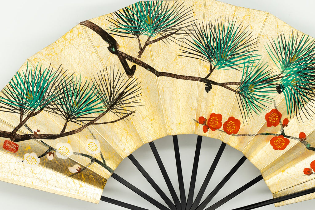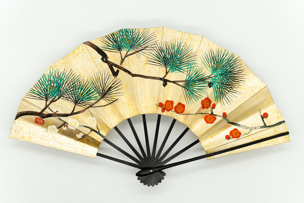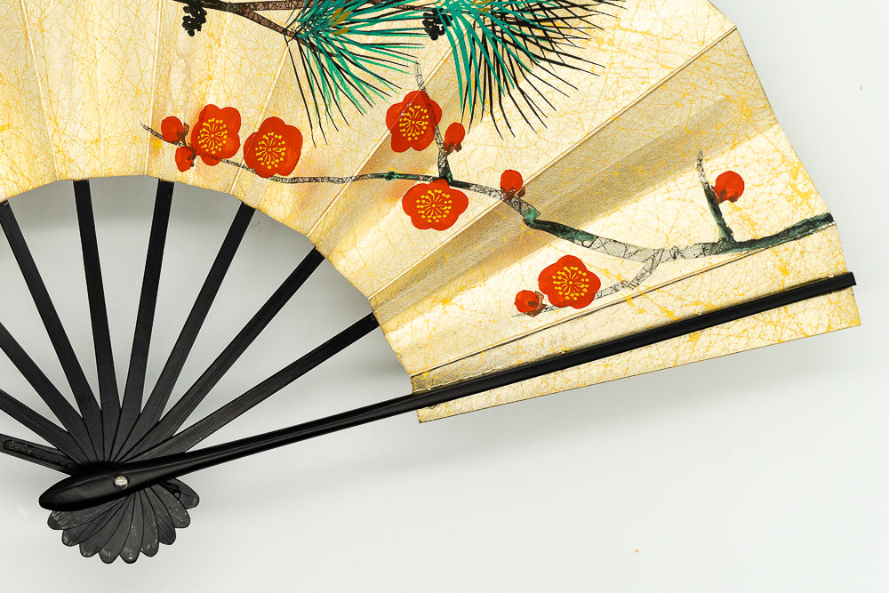 上質な金もみ地に老松、もう片面には枝松と紅白梅が手描きで描かれています。松は一年中青いため「永遠の命」の象徴で縁起がよいとされています。お祝いの席にも最適でお好みに合わせて両面お使い頂けます。