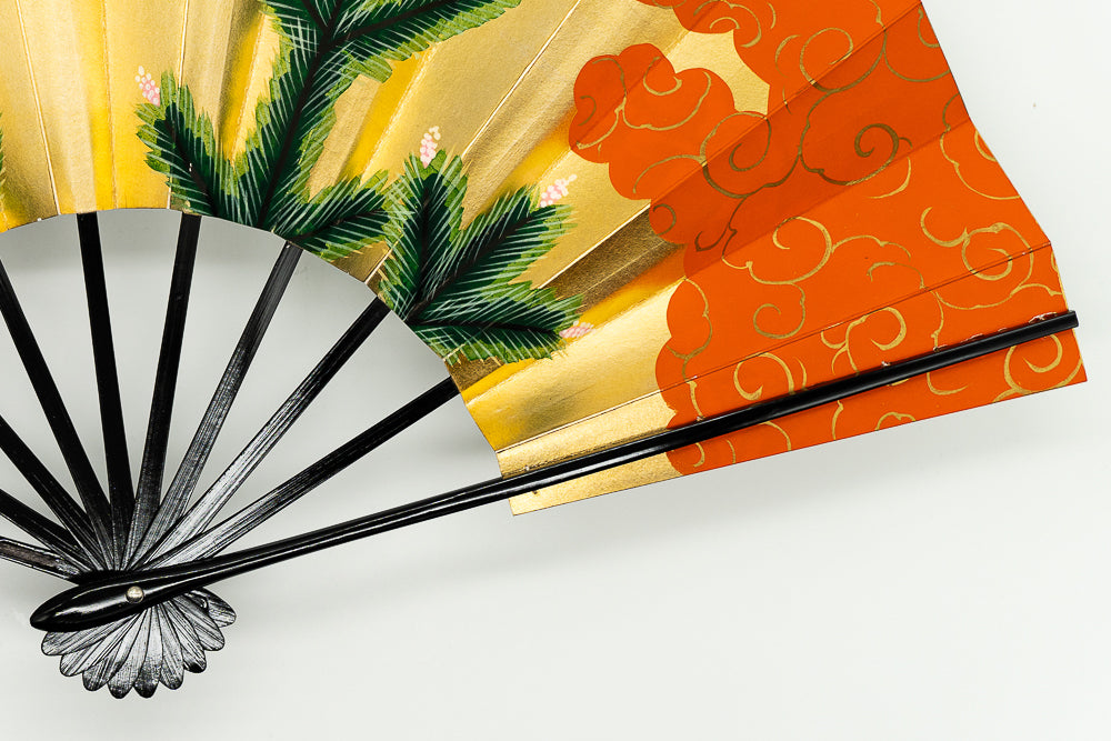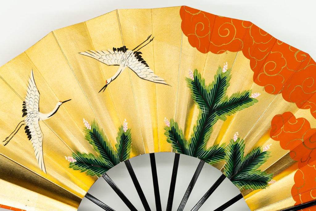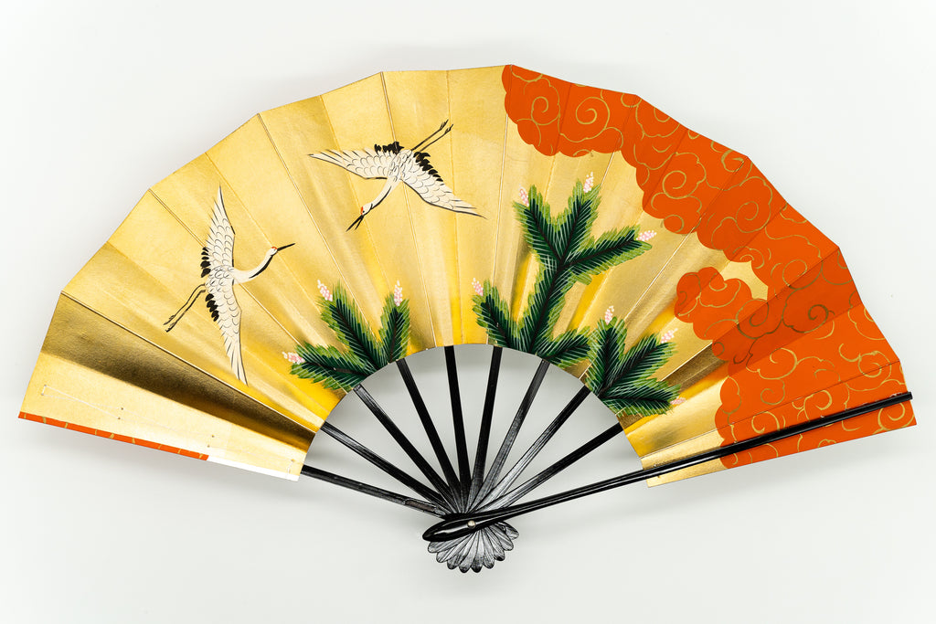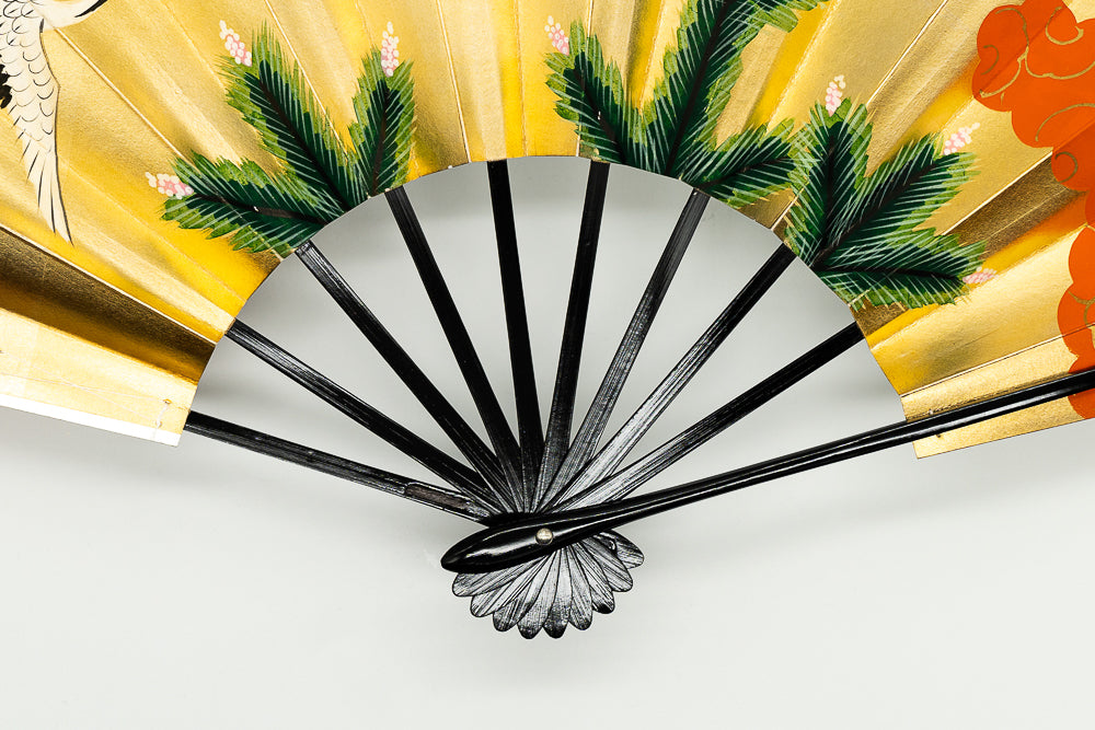 【ビンテージ品】上質な金箔地、銀箔地に若松と優雅に羽を広げて羽ばたく鶴が描かれています。日本では鶴は生命力と長寿の象徴、つがいと一生添い遂げることから夫婦円満の象徴でもあります。松は一年中青いため「永遠の命」の象徴で縁起がよいとされています。朱の雲どりに金の唐草模様がおめでたい雰囲気を添えており、お祝いの席にも最適です。地紙の色によってそれぞれ印象が異なり、お好みにより楽しんで頂けます。