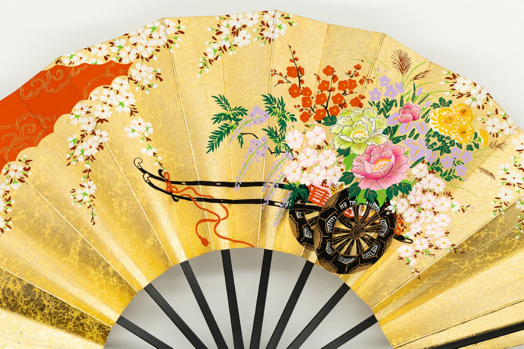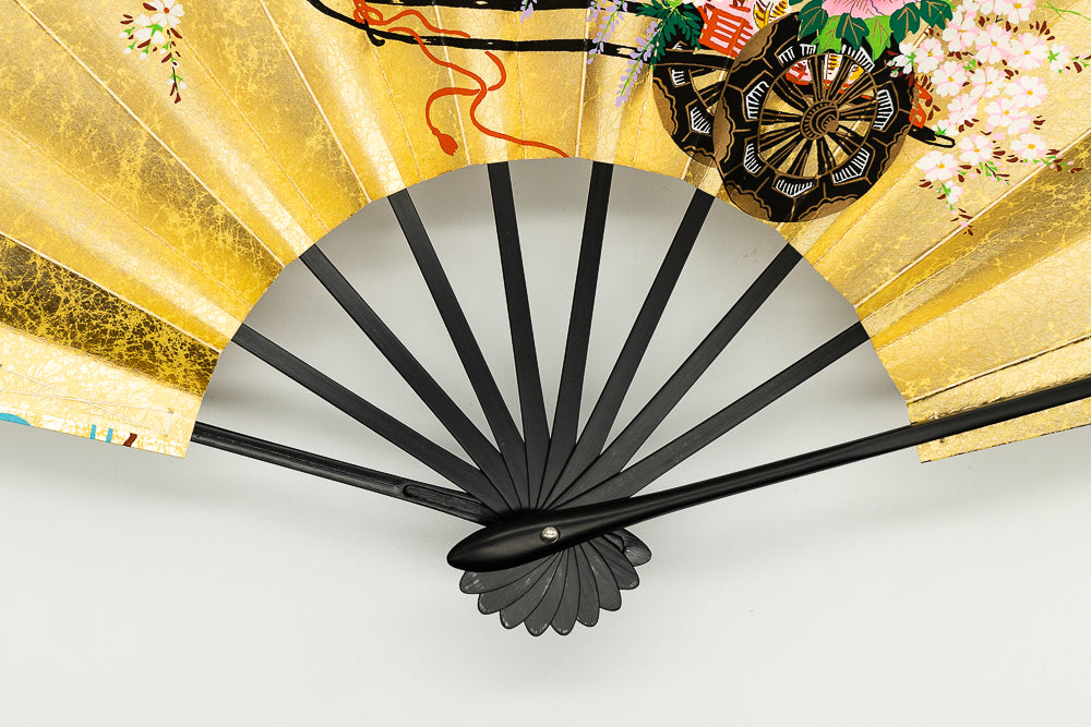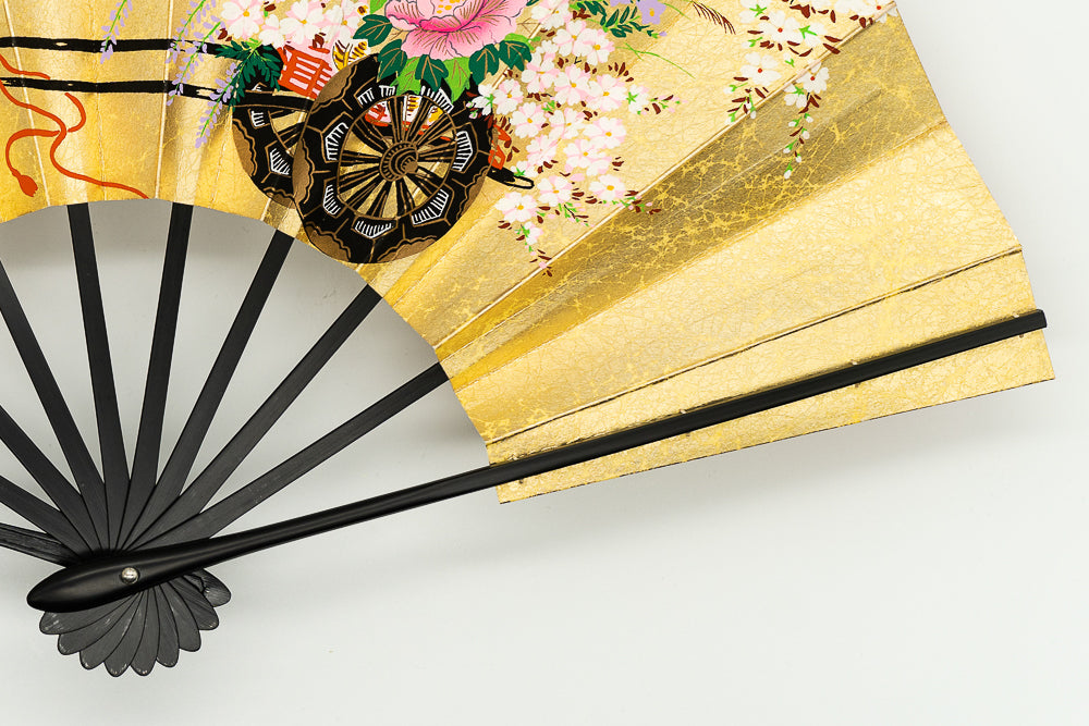 上質な金モミ地に色とりどりの花々を乗せた花車が描かれています。もう片面には花筏あしらわれ、流水がアクセントになっています。大変豪華で華やかな仕上がりとなっています。