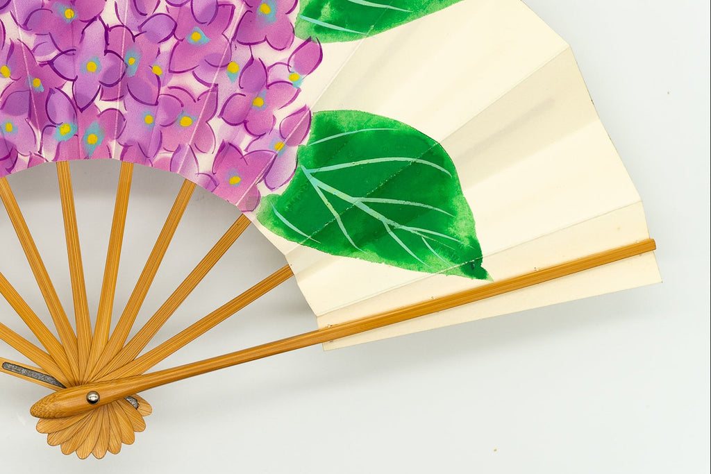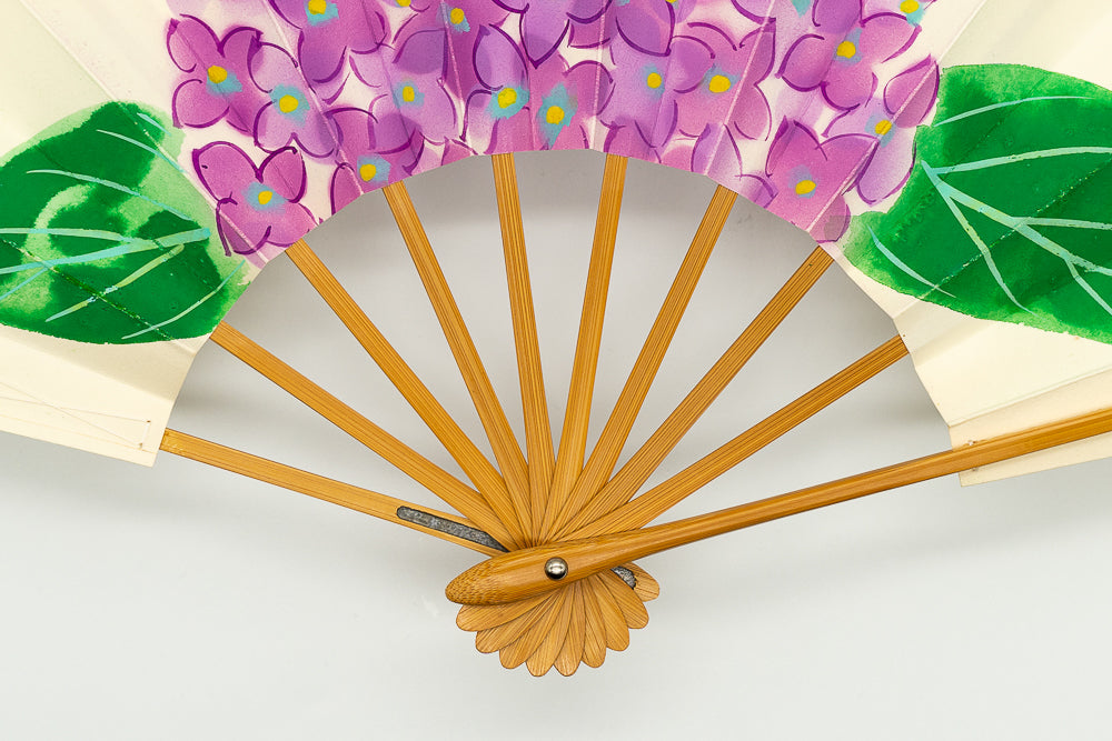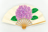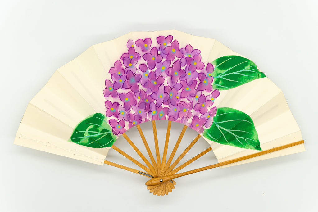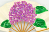 鳥の子地の扇面に手描きで紫色の紫陽花を大胆に描いています。