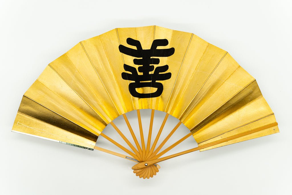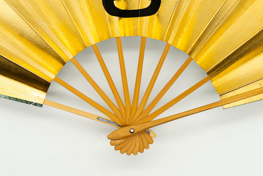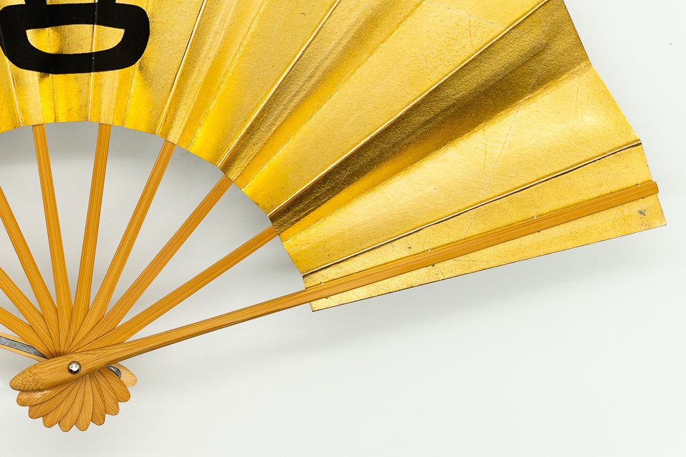 【ビンテージ品】上質な金箔地に黒で善の文字を描いています。日本舞踊の演目「神田祭」で使用される絵柄です。裏面は銀箔地にさざ波が手描きで描かれています。