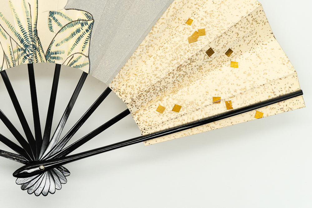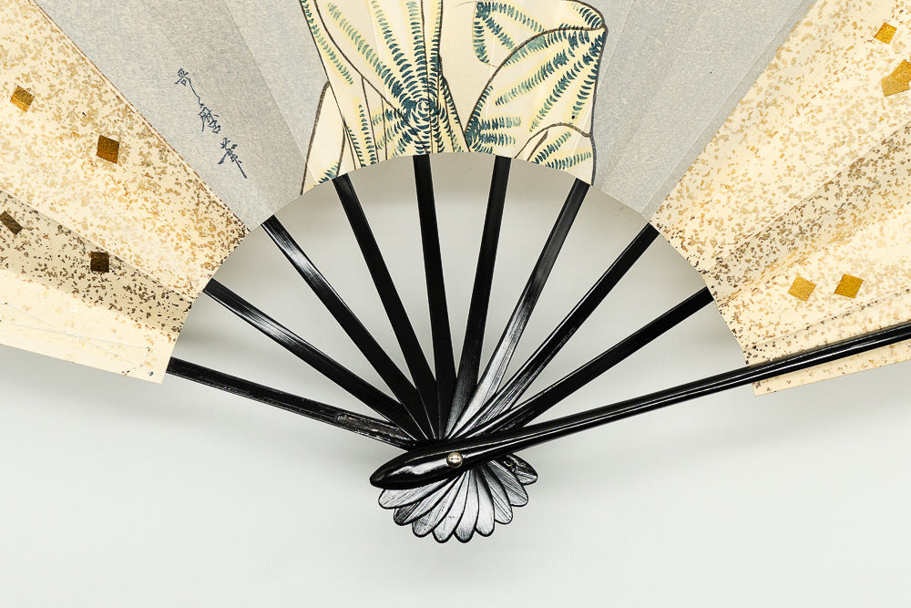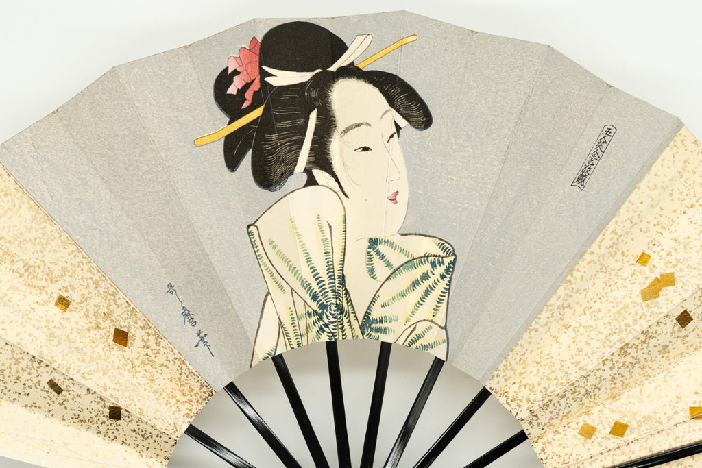 鳥の子地に金の小石砂子、北川歌麿の美人画が描かれています。一色一色を丁寧に刷り上げ、職人の手間暇が感じられる一品です。