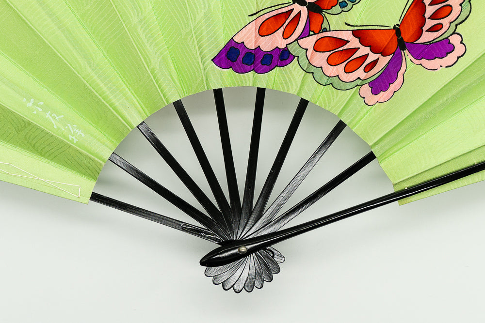 京友禅を扇に仕立てた珍しいお品です。布地ならではの質感が印象的で鮮やかな蝶が舞い、ポップな印象で個性溢れる一品となっています。