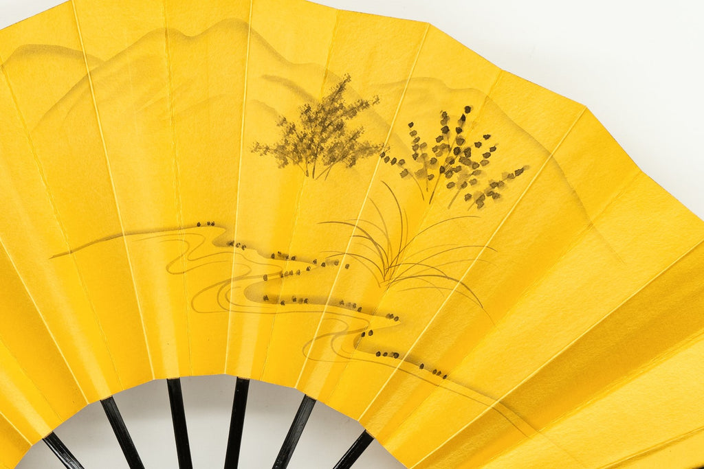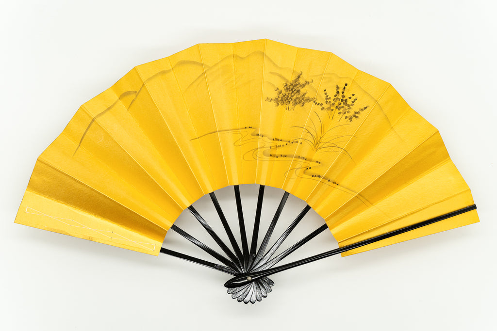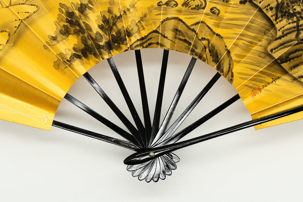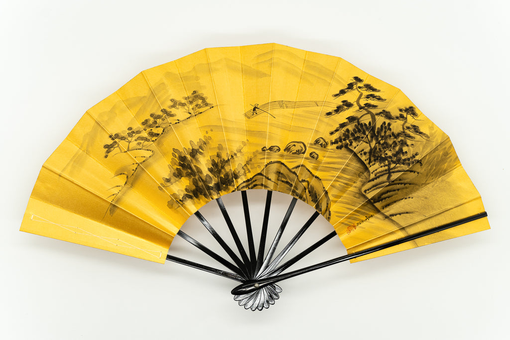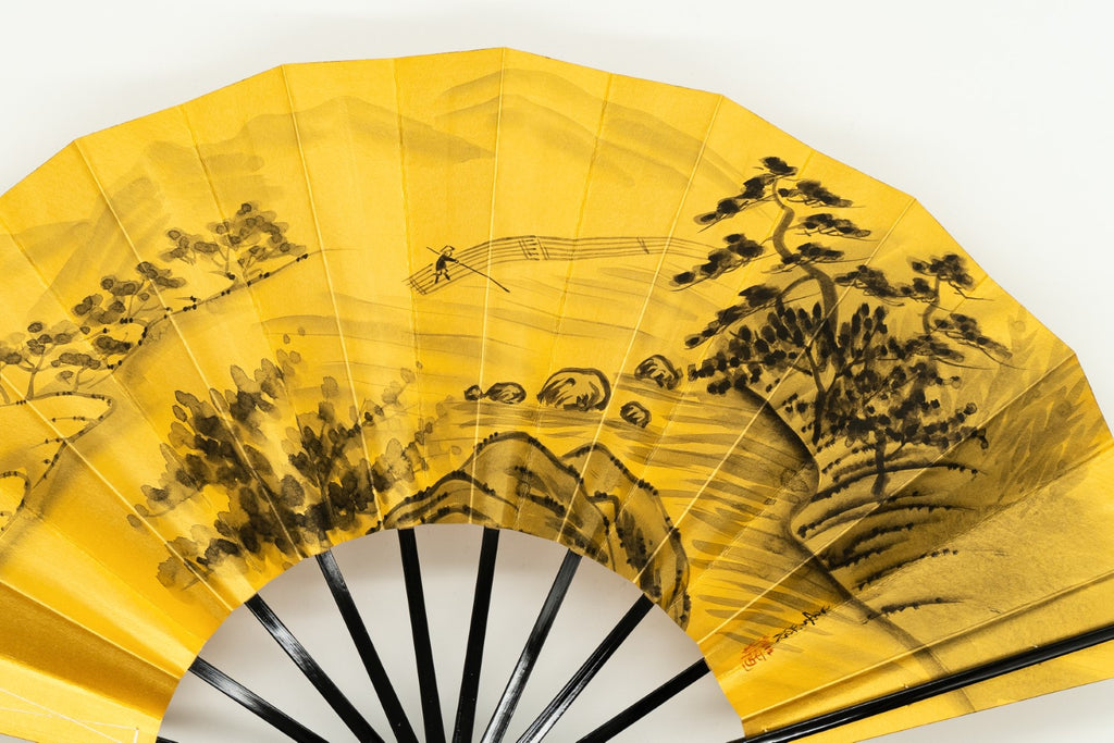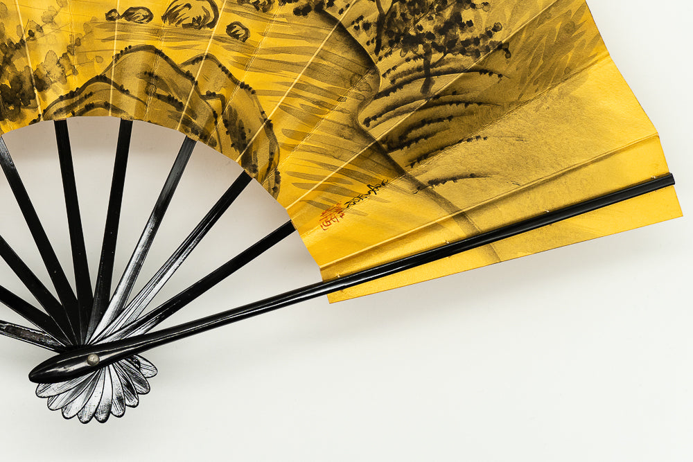 ゴールド地に墨絵で山水と筏が描かれています。裏表で違った趣を楽しんで頂けます。