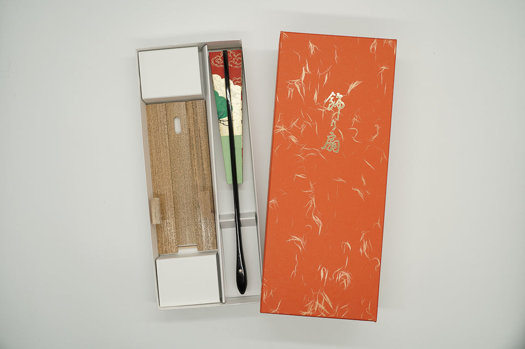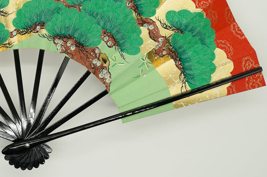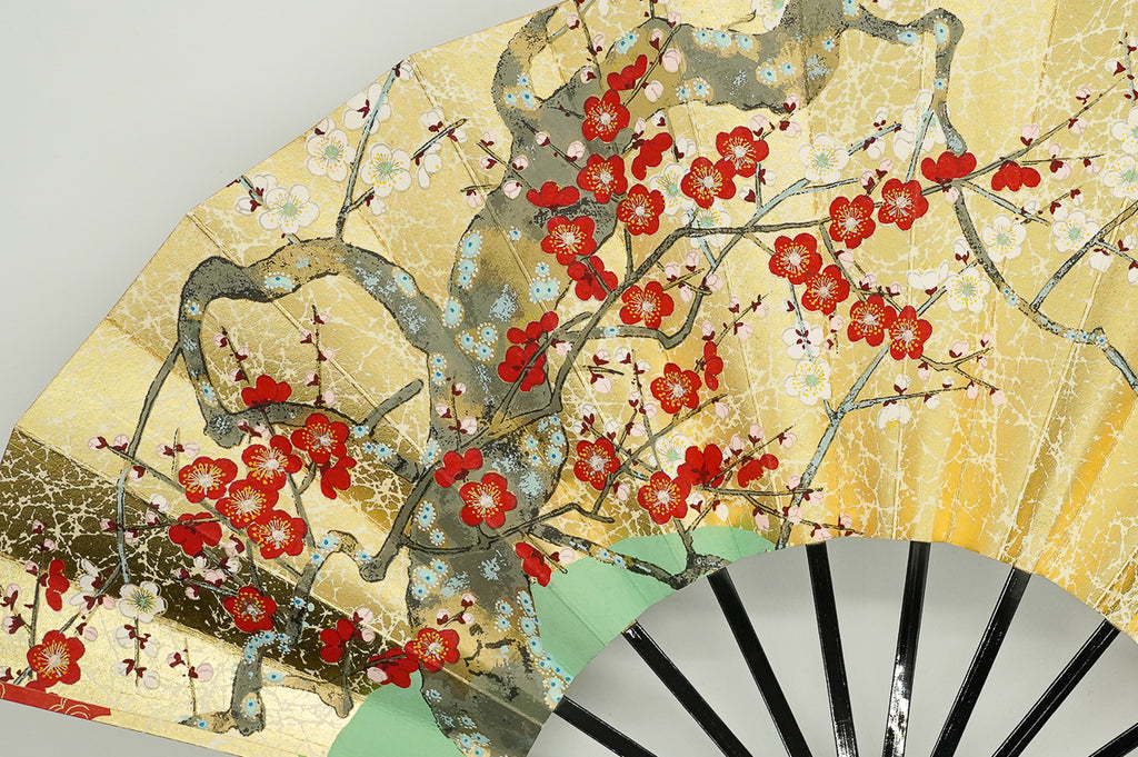 金もみ地の扇面に二羽の鶴と松、もう片面には紅白の梅が描かれています。お祝い事や贈物にもぴったりのデザインです。季節やお好みに合わせて両面お使いいただけます。